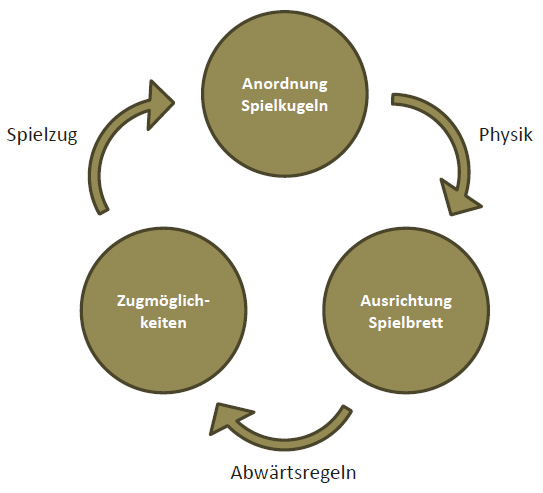 Die Verteilung der Spielkugeln auf dem Spielbrett bestimmt, wie jeder einzelne Hebel - und damit das gesamte Spielfeld - ausgerichtet ist. Die acht Hebelstellungen beeinflussen nun die Spielzüge, welche für den Spieler möglich sind. Denn in Längsrichtung darf nur "abwärts" gezogen werden. Der konkrete Zug, welcher durch den Spieler durchgeführt wird, bewirkt dann wieder eine neue Anordnung der Kugeln, was wieder eine ganz bestimmte Ausrichtung des Spielfeldes (der Hebel) zur Folge hat. Dies hat erneut Einfluss auf die denkbaren Zugmöglichkeiten - und so weiter ...! Dieser "Kreislauf" setzt sich im Spiel laufend fort und bewirkt die einzigartige Dynamik von heblo.