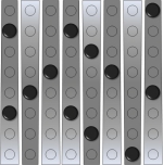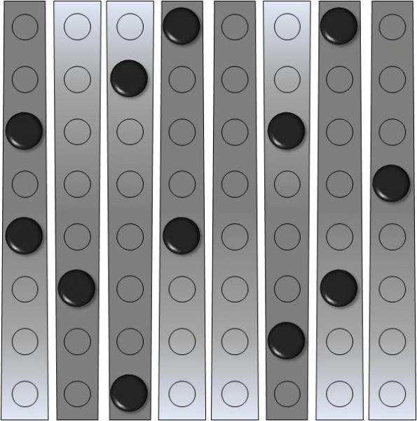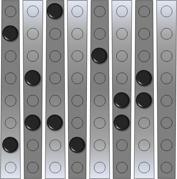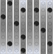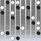 Beim Pärchen-Rätsel sind bei vorgegebener Anordnung von schwarzen Kugeln genau gleich viele silberne Kugeln so zu platzieren, dass jede silberne Kugel direkt neben einer schwarzen Kugel (rechts, links, vor oder hinter) liegt und jede schwarze Kugel einer silbernen Kugel zugeordnet ist (Pärchenbildung). Nach dem Ablegen der silbernen Kugeln müssen alle acht Hebel des Spielbretts zur gleichen (egal welche) Seite geneigt sein. Es kann mehrere Lösungen geben.